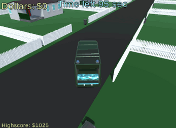 You drive a garbage truck and collect garbage from the neighborhood, you get $125 in total per garbage container you empty. When time runs out (after 120 sec) you give the money to a charity.